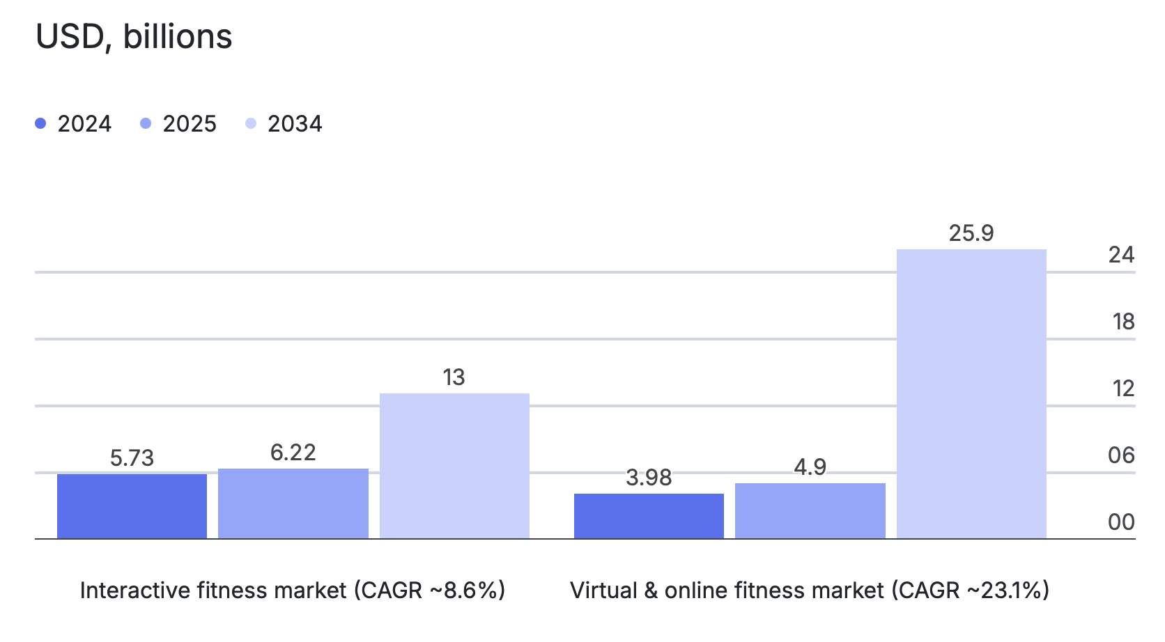 DataIntelo - Interactive fitness market: $5.73B in 2024 → $6.22B in 2025 → $13B by 2034 (CAGR ~8.6%)