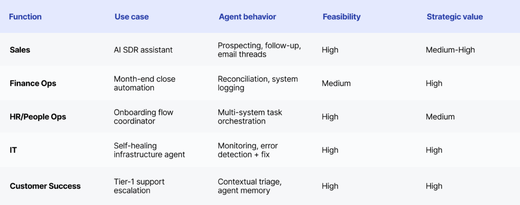 This matrix summarizes high-leverage, enterprise-ready use cases for agentic AI, organized by function. It highlights not only where agent behavior maps naturally to common workflows, but also how feasible each use case is today, and how valuable it could be strategically.
